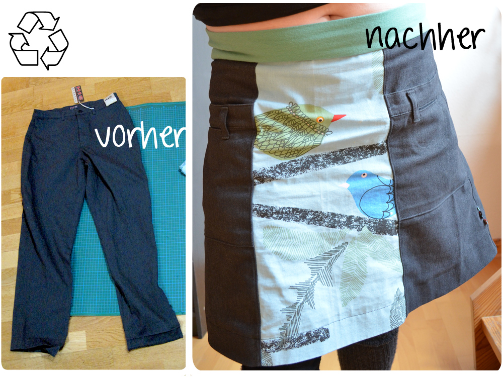 Ich liiiiiiebe den Vogerlstoff, und Upcycling! Den Rockschnitt hab ich glaich mal gespeichert. Er passt dir hervorragend!