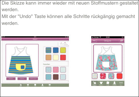 Mit der siunic Nähdesigner App kannst du Schnittmusterskizzen mit Stoffen unterlegen und so deine Nähprojekte planen. Und die Stoffe und Schnitte dann auch gleich bestellen. Auch eigene, selber fotografierte Stoffe können zum Gestalten verwendet werden. So erhältst du dann sofort eine praktische Vorschau auf Dein Nähprojekt und kannst mit verschiedensten Stoffzustammenstellungen spielen.