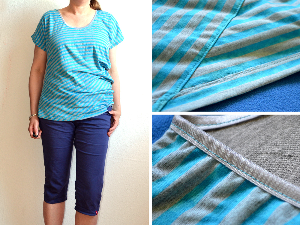Der Ringeljersey stammt vom letzten Stoffmarkt (das Kind hat aus der pinken Variante auch schon ein Shirt bekommen). Über das undefinierbare Material hatte ich mich eigentlich schon geärgert, aber für Elaine ist es gar nicht schlecht. Zumindest fällt es sehr labberig schön leicht und fließend (Polyester?!?) .