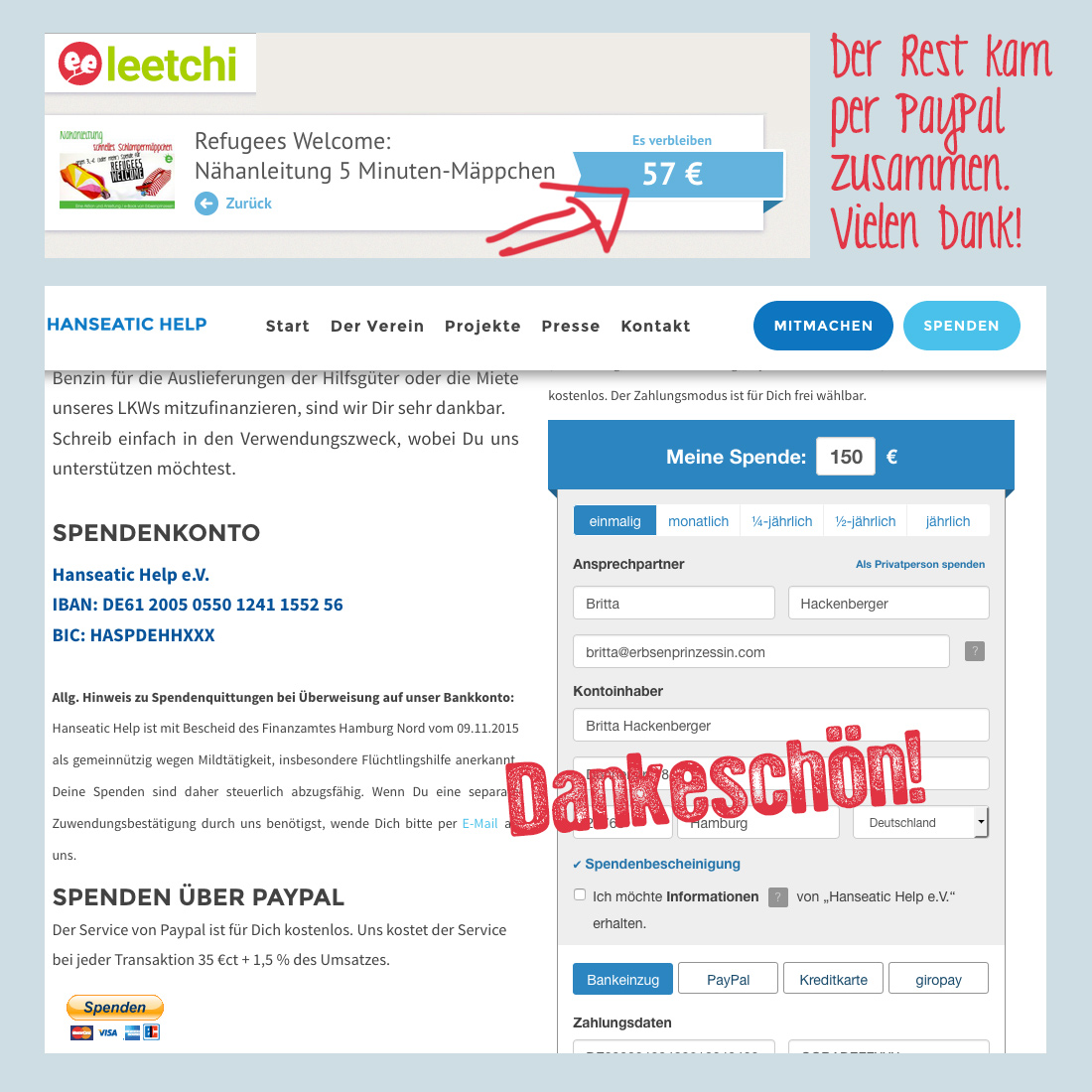Wer spenden möchte, bitte direkt an Hanseatic Help oder Refugees welcome, nicht mehr an mich – das Hin- und Herschicken von Geld kostet immer nur unnötige Gebühren.