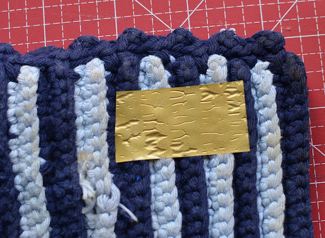 Metallische Folie, heiß und lange aufgebügelt auf grobmaschiger Baumwolle.