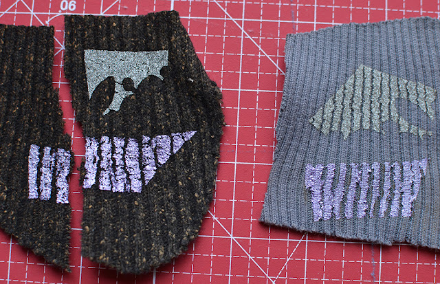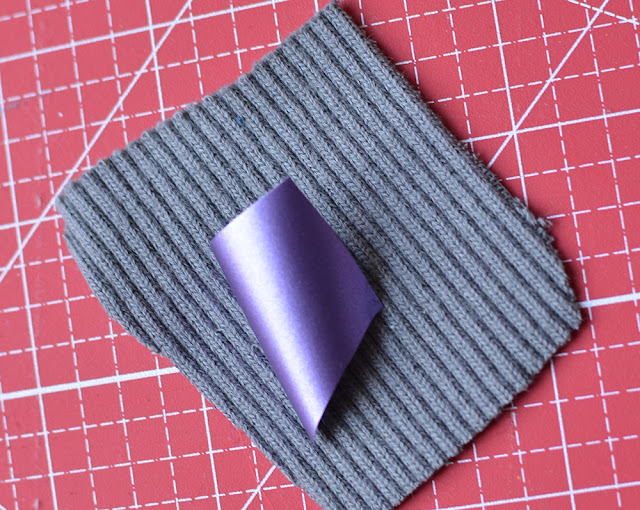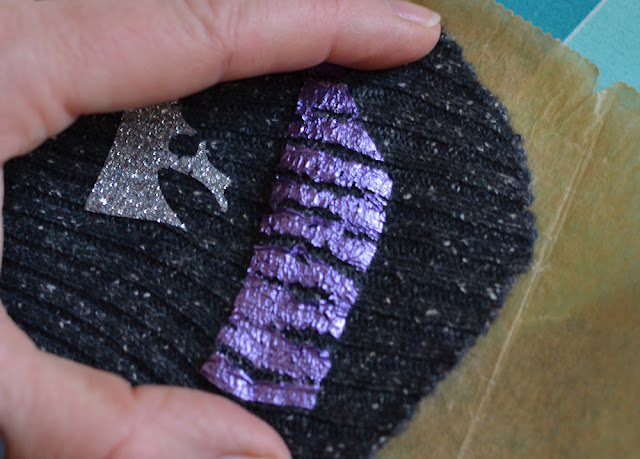 Hm. Der graue Bündchenstoff ist wohl nicht grobmaschig genug, und die silberne Glitzerfolie* ist zu fest und wird beim Zerreißen bröckelig.